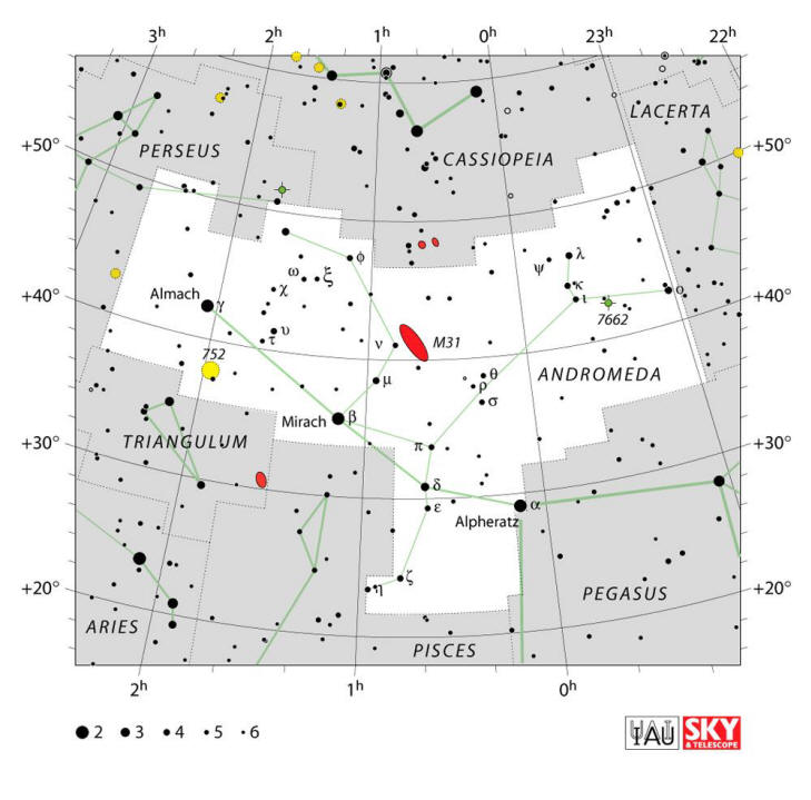 Carta de la constelación Andrómeda. Crédito: IAU, revista Sky and Telescope.