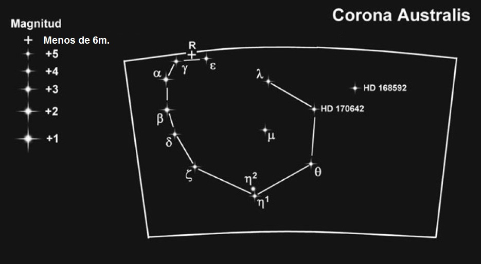 Constelación de Corona Australis. Estrellas resaltantes. Crédito: The Star Atlas Companion. Philip Bagnall.