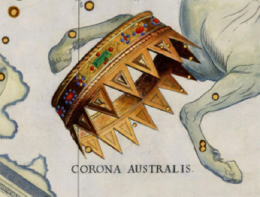 Corona Australis, la Corona del Sur, era conocida por los griegos como Corona. Antes de que Ptolomeo presentara sus estrellas como una constelación separada, Corona Australis era conocida como un círculo de estrellas cerca de las patas delanteras del centauro representado por la constelación vecina Sagitario.