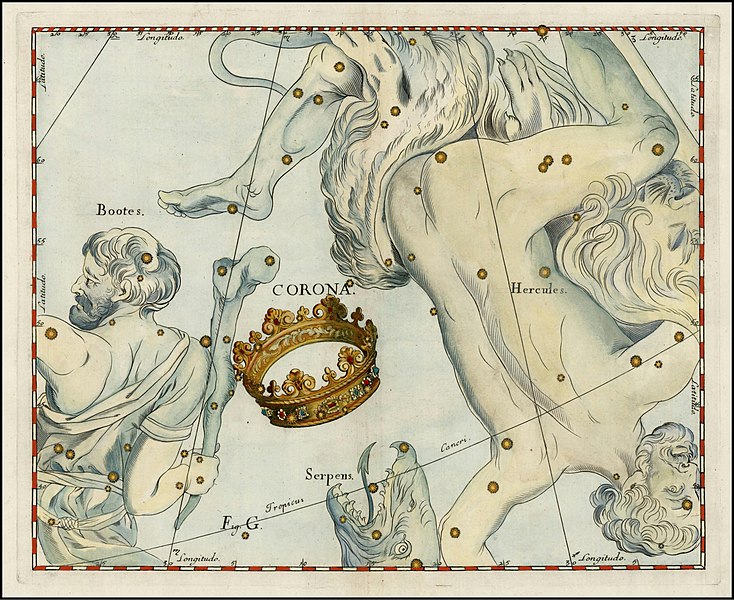 La constelación de Corona Boreal reconocida por los griegos antiguos simplemente como Corona representa la tiara de Ariadna, hija del rey Minos de Creta, que ayudó a Teseo a matar al Minotauro.