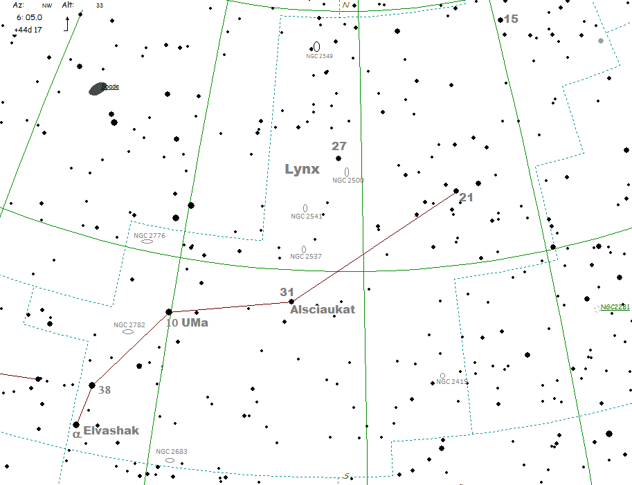 Entre las antiguas constelaciones de Cochero, Gemelos, Osa Mayor y León, existe una región pobre en estrellas brillantes. Tal circunstancia condujo al célebre astrónomo polaco de la ciudad de Gdansk, Johannes Hevelius a cartografiar en esta región del cielo a una constelación constituida por estrellas de débil brillo, a la que denominó Lince, ya que había que tener ojos de este animal para poder verla.