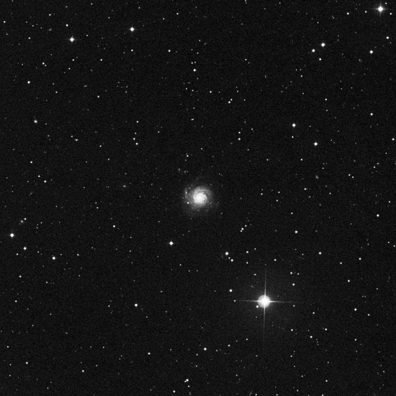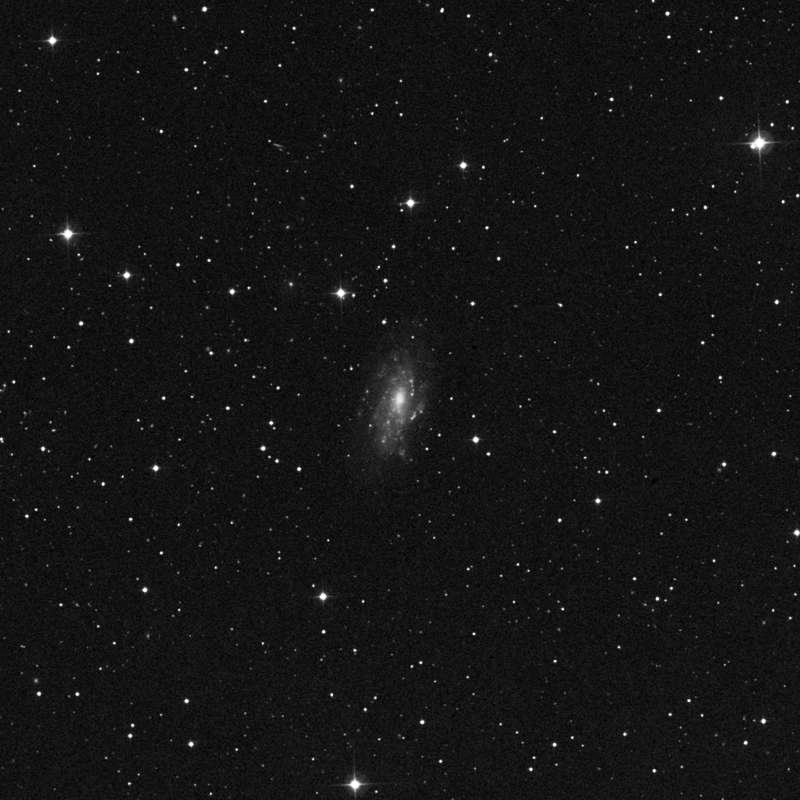 Galaxia espiral barrada NGC 2537. Crédito: DSS2r. El campo angular de la imagen es equivalente al tamaño de la Luna Llena (0,5° X 0,5°).