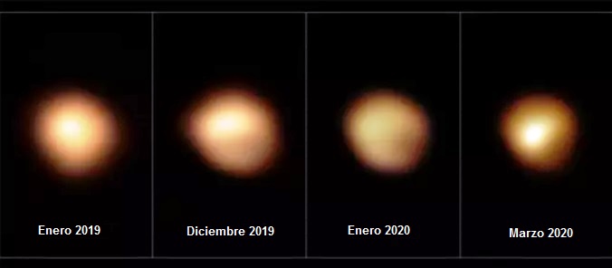 Imágenes de Betelgeuse tomadas con el instrumento SPHERE, instalado en el Very Large Telescope (Chile), en enero de 2019 (con su brillo normal), diciembre de 2019, enero de 2020 y marzo de 2020, en las que se observa la gran atenuación de la estrella, especialmente en su zona austral. En abril de 2020 su brillo volvió a la normalidad. / ESO/M. Montargès et al.