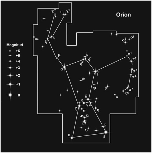 Constelación de Orión. Estrellas resaltantes. Crédito: The star Atlas companion. Philip Bagnall.