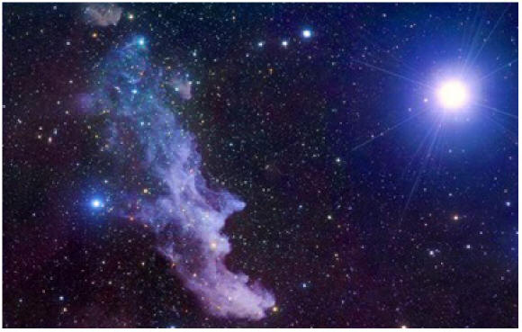 Rigel está asociada con varias nubes de polvo cercanas que ilumina. La más famosa de ellas es IC 2118, también conocida como la Nebulosa Cabeza de Bruja, una débil nebulosa de reflexión situada a unos 2,5 grados al noroeste de Rigel, en la constelación de Eridanus. La imagen que se presenta se encuentra rotada 180° para que se pueda apreciar el perfil de la bruja cósmica.