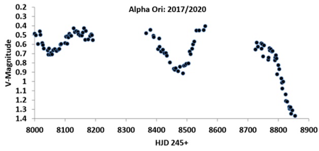Betelgeuse varía entre +0m,2 a +1m,2 y había descendido del nivel más bajo en magnitud. Para el 19 de diciembre se midió su magnitud en +1m,64. Roger Jiménez y Jesús Guerrero, de ALDA, midieron desde el Complejo de Observación Astronómica Tayabeixo, COAT, una magnitud de +1m,63 el 23 de diciembre de 2019.