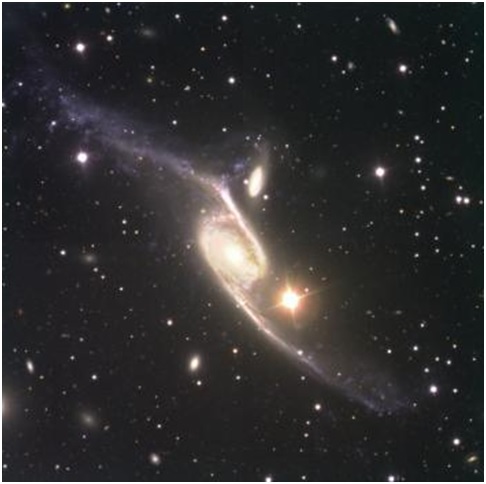 La galaxia más deformada (NGC 6872) es la galaxia en espiral SBb. La galaxia más pequeña, IC 4970, se observa justo encima de ella y es de tipo SO. La estrella brillante debajo del par en esta imagen del Observatorio Europeo del Sur, ESO, pertenece a nuestra galaxia.