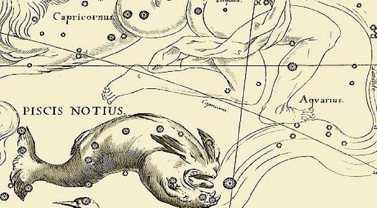 Constelación de Piscis Austrinus. En Firmamentum (1690) de Johann Hevelius aparece como Piscis Notius.