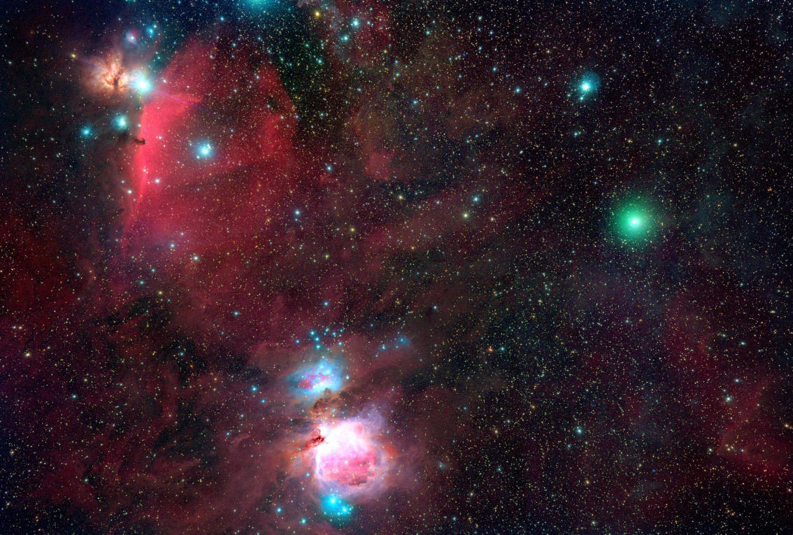 Esta hermosa imagen nos muestra al cometa C/2020 M3 (ATLAS), de color verdoso, transitando la constelación de Orión, el Cazador.