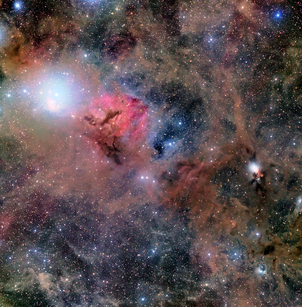 La fabulosa imagen muestra otras nebulosas polvorientas, dispersas alrededor del campo celeste capturado. Resaltan las débiles áreas de resplandor rojizo característica del gas hidrógeno ionizado. La gran cantidad de polvo cósmico presente en la nube molecular, oculta muchos de los objetos estelares jóvenes, recién formados y protoestrellas, de los telescopios ópticos.