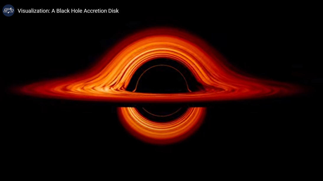 La descomunal gravedad del agujero negro desvía la luz emitida por el disco, y se termina formando una figura abstracta e inusual. La interpretación visual del objeto se torna todo un reto, debido a que la figura de un disco que tenemos asociada en nuestro cerebro, es un plano circular, pero este objeto, visualmente es como la intersección perpendicular de dos discos, y más aun, la figura no presenta la recta que generarían los puntos de intersección de ambos planos, en sí, es como si la figura se desdoblara.