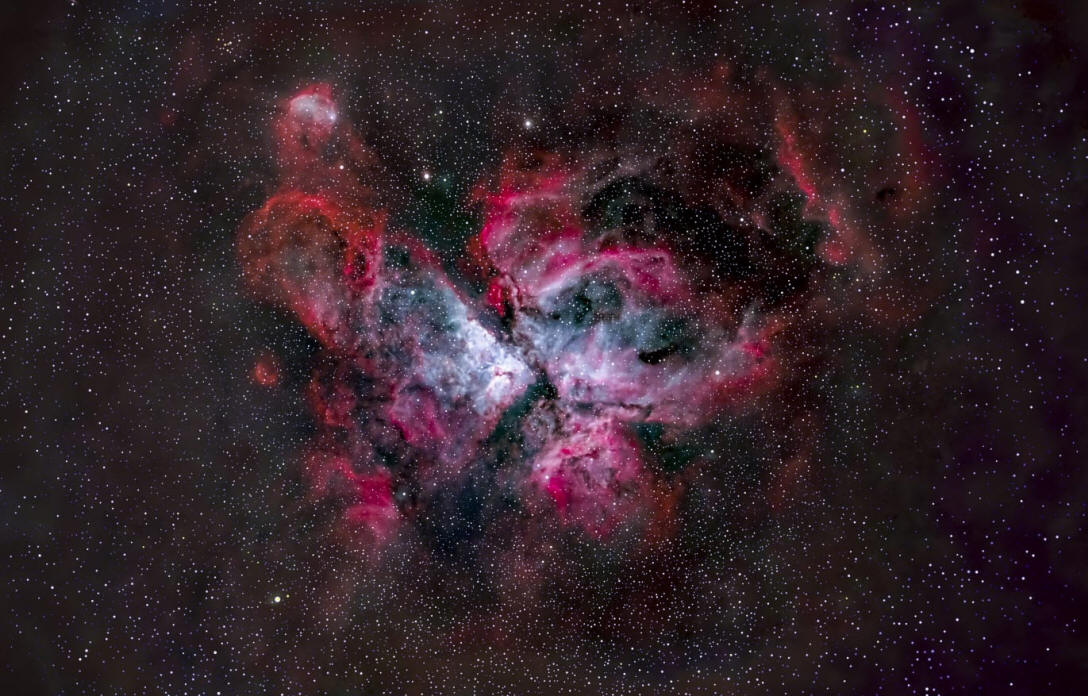 La Nebulosa de Carina es una de las más extensas en el cielo. Es más brillante que la Nebulosa de Orión, es cuatro veces más grande y está unas 5 veces más alejada. Dista de la Tierra 9.000 años luz y abarca más de 300 años luz.