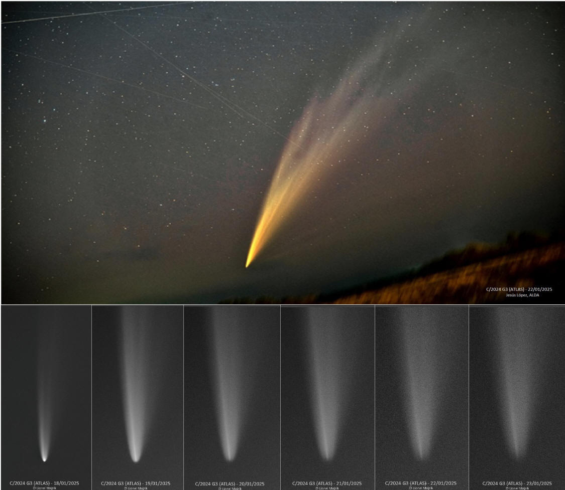 A lo largo de la Campaña de Observación y Registro del Cometa C/2024 G3 (ATLAS), impulsada y llevada a cabo por ALDA, miembros y colaboradores de la asociación obtuvieron muy buenas imágenes, que junto a observaciones visuales proporcionaron datos sobre el núcleo, coma y grado de condensación, cola y magnitud visual. El registro se hizo, y entre las imágenes están dos que corresponden al 17 de enero, 23:08 UT (Roger Jiménez, ALDA) y 18 de enero, 22:45 UT (Douglas Marín, amigo y colaborador de ALDA), ambas, probablemente las únicas en Venezuela y de venezolanos, que muestran con claridad la última vista del núcleo del cometa y la primera de este sin núcleo.