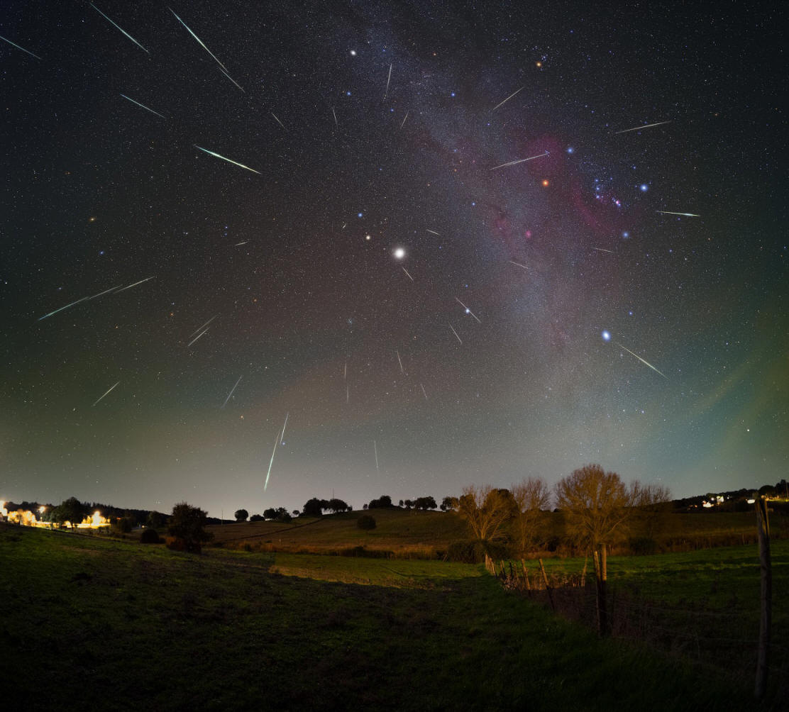 La escena se construyó seleccionando 40 exposiciones que contienen meteoros de unas 500 realizadas en la noche del 13 y madrugada del 14 de diciembre, cerca de la actividad máxima de la lluvia anual de meteoros Gemínidas de este ańo.