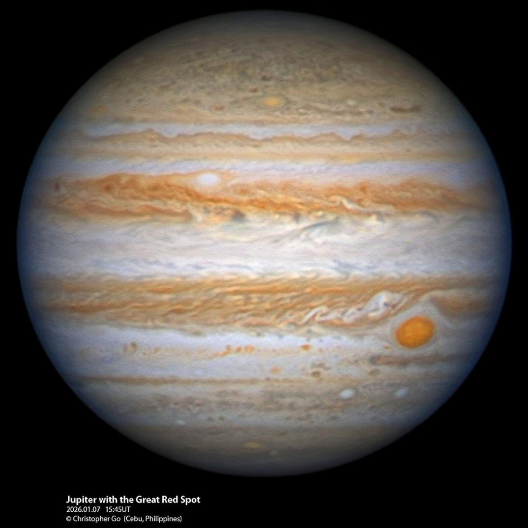 El famoso y persistente vórtice anticiclónico de Júpiter, conocido como la Gran Mancha Roja, se visualiza al sur del ecuador, en la parte inferior derecha. Aunque se sabe que la Gran Mancha Roja de Júpiter está encogiéndose, sigue siendo de mayor tamaño que la propia Tierra.
