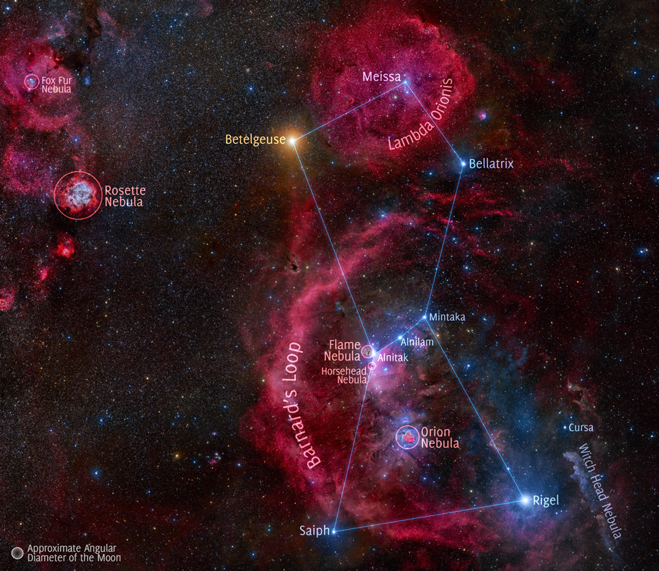 De los muchos detalles interesantes que se han hecho visibles, además de la siempre llamativa Nebulosa de Orión, uno que particularmente llama la atención es el Bucle de Barnard, el filamento en forma de arco de color rojo brillante que se extiende a través de la constelación. En la parte superior, en torno a la estrella Meissa, la tenue nebulosa Lambda Orionis.