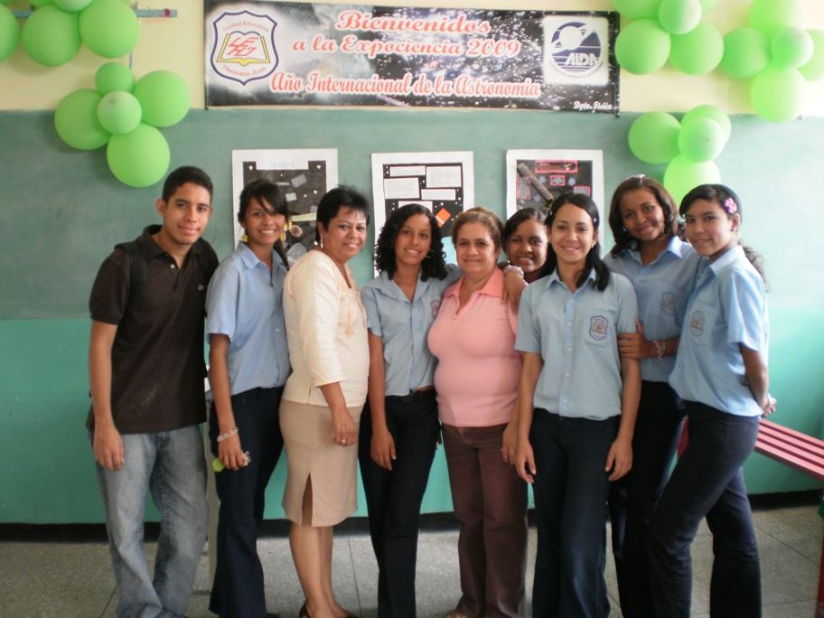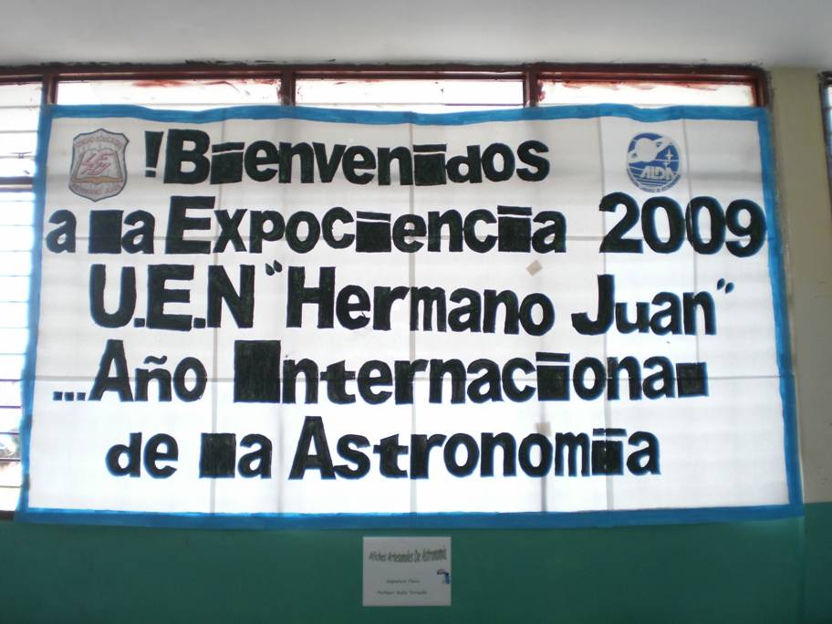 Pancarta alusiva al evento. Este año se privilegió el “Año Internacional de la Astronomía”. A los extremos de la pancarta, los logos del liceo “Hermano Juan” y de nuestra asociación, quien estuvo representada por Andrés Eloy Mendoza, Dorquis Camacho, Mariela Peña y Francisco Suárez.