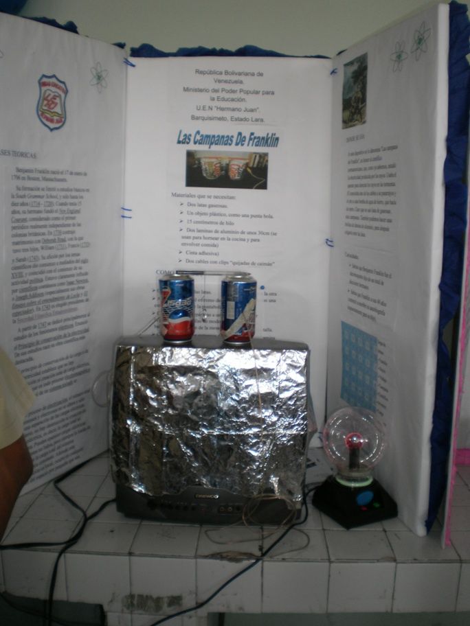 Las campanas de Franklin, en alusión a Benjamín Franklin. El televisor se carga y eso se transmite al papel aluminio que a su vez lo transmite a las latas arriba. Un pequeño anillo cuelga allí y según la polaridad de la carga, éste se va hacía una de las latas. Muy interesante experimento.
