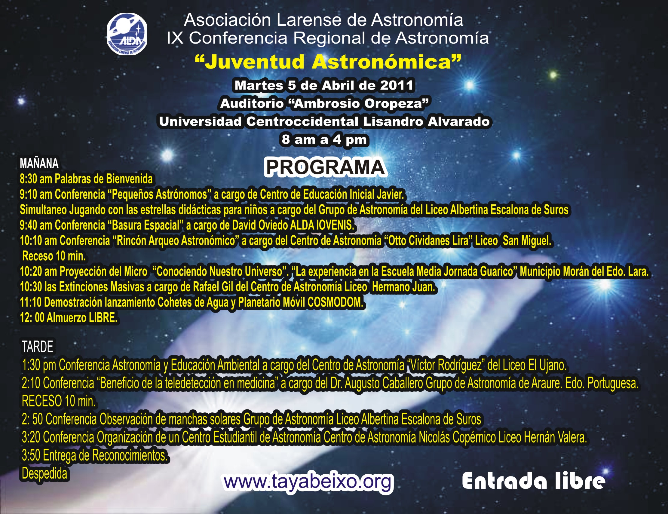 El 21 de julio se dicta un ciclo de conferencias en la Universidad Yacambú. Vida en el Universo y Colonización del Sistema Solar son los temas dictados por Jesús Guerrero y Rafael Barrios.
