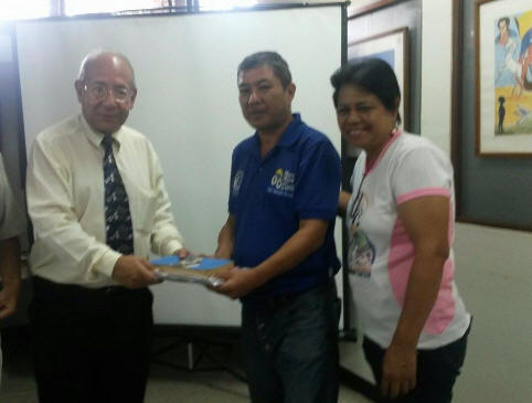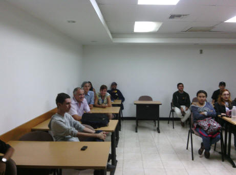 Gilbert Sánchez y Mariela Peña, miembros de ALDA, con el Dr. Marcos Peñaloza. Parte del estudiantado asistente.