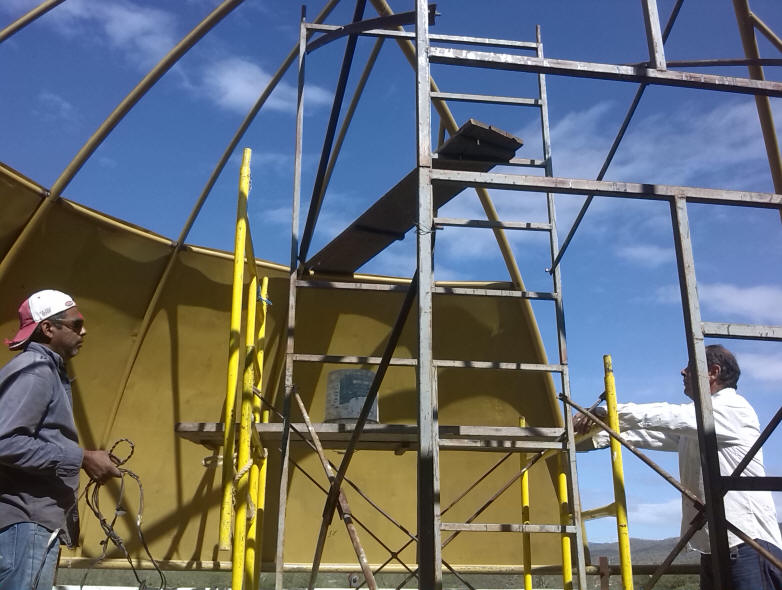 Oscar Alvarado y Juan Luis colocando las láminas de la cúpula principal.