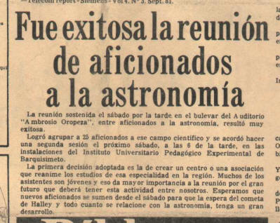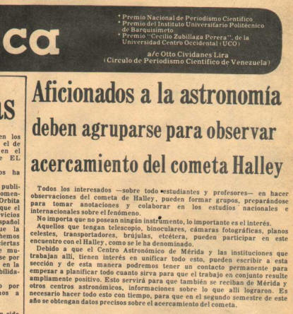 Nota de prensa informando sobre la primera reunión de aficionados en Barquisimeto, interesados en observar el cometa Halley.