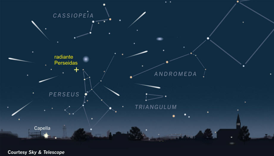 Posición del radiante de la lluvia de meteoros Perseidas. Mirando hacia el Noreste a la medianoche.
