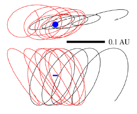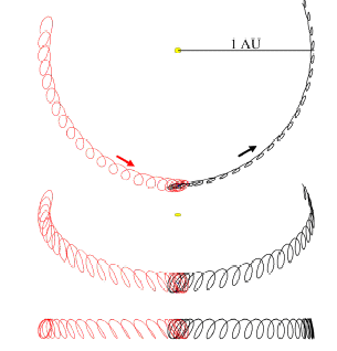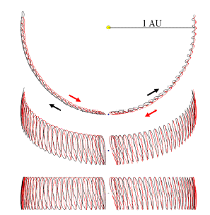 Figura 3. Órbitas Parciales de 2002 AA29 en 1881-1933 y 1976-2028, con vistas y escalas similares a la Fig. 1. La visita actual se muestra a la derecha con el acercamiento en rojo. El alargamiento del semieje mayor “a” resulta de la captura por parte de la Tierra. El asteroide fue perturbado, disminuyendo su semieje mayor y lanzándose hacia delante (orbita en negro). En la última visita, ocurrida en 1908 (a la izquierdo) el asteroide se acercó al disminuir “a” (en rojo) y fue perturbado, alargando el semieje mayor “a” y se quedó detrás (en negro). La mayor inclinación de su órbita produce vueltas verticales mas grandes que para 2003 YN107.