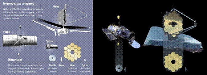 Figura 3. El telescopio espacial Hubble y futuro telescopio orbital James Webb. Fuente: Goddard.