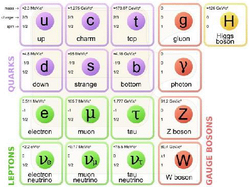 Creemos que los constituyentes elementales de la materia los hallamos resumidos en la famosa Tabla Periódica de los Elementos que el famoso Dimitri Mendeleiev ordenó y clasificó y esto no es así. El llamado “Modelo Estándar de la física de partículas” (figura 8) predice que la naturaleza de la materia está compuesta por un puñado de partículas que dan cuenta de las halladas en dicha tabla además de las partículas mediadoras de las interacciones de las fuerzas de la naturaleza, las cuales se denominan: