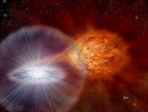 Las Supernovas son estrellas masivas que explotan debido a que han llegado al final de sus vidas, conocemos varios tipos, uno especial llamadas Supernovas tipo Ia, que son sistemas binarios formados por una estrella llamada enana blanca y una compañera gigante. Durante el proceso de evolución del sistema la estrella enana va desgarrando materia de la compañera aumentado su masa al formar a su alrededor un disco de acreción, y debido a ello, llegando a un límite muy preciso (1,44 masas solares), las estrellas de esta clase explotan con la misma luminosidad intrínseca, siendo además su brillo mayor que el de una galaxia entera. Son faros cósmicos para estudiar el Universo en las profundidades del espacio (figura 10).
