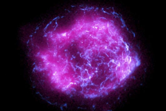 Esta imagen del remanente de supernova Cassiopeia A combina algunos de los primeros datos de rayos X recopilados por el Explorador de polarimetría de rayos X de imágenes de la NASA, que se muestra en magenta, con datos de rayos X de alta energía del Observatorio de rayos X Chandra de la NASA, en azul. Crédito: NASA/CXC/SAO/IXPE.