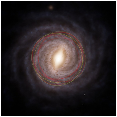 ![]() Vista superior de la Vía Láctea que muestra las órbitas estimadas de nuestro Sol y del cometa 3I/ATLAS. 3I/ATLAS se muestra con líneas discontinuas rojas y el Sol con líneas punteadas amarillas. Crédito de la imagen: M. Hopkins/Equipo Ōtautahi-Oxford. Mapa base: ESA/Gaia/DPAC, Stefan Payne-Wardenaar.