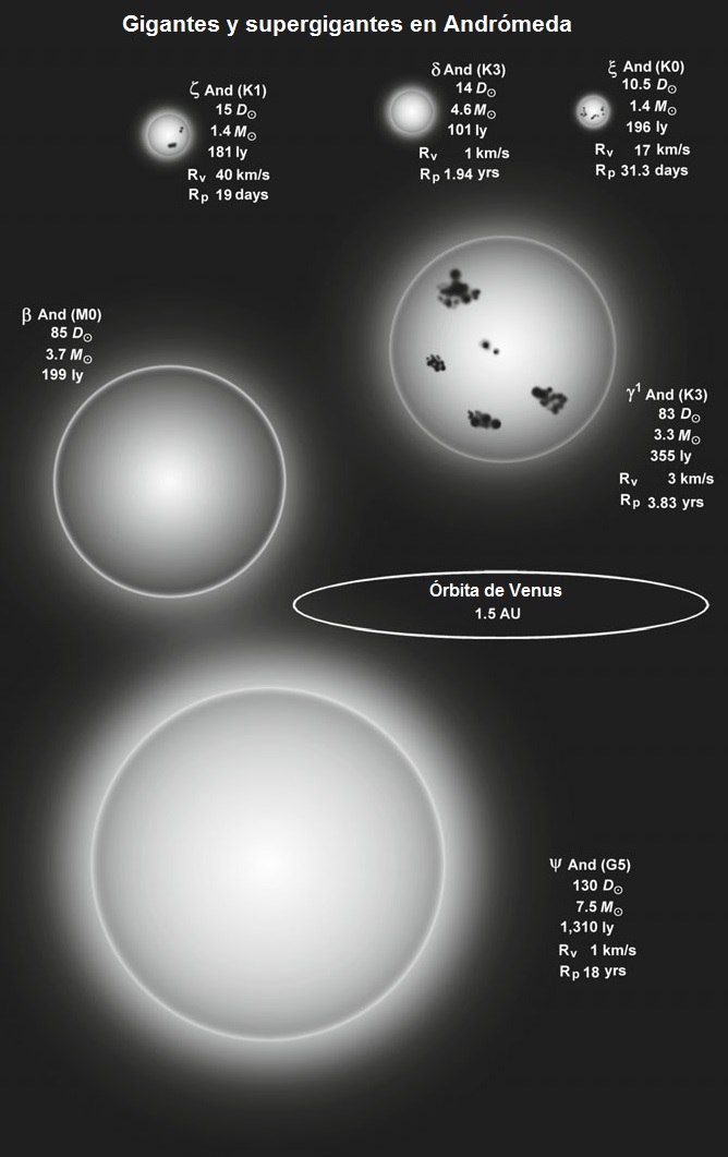 Ψ (Psi) Andromedae es la estrella más grande y masiva de la constelación. Con un tamaño equivalente a 130 veces el tamaño del Sol y unas 7,5 veces su masa, la estrella se encuentra a unos 1.310 años luz de distancia. Su clase espectral es G5. Si la sustituyésemos por nuestro Sol, su fotosfera alcanzaría casi la órbita de Venus.