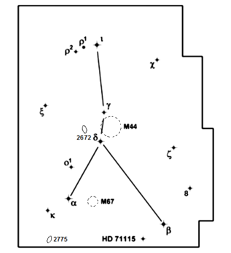 Un grado al NE de d Cancri se encuentra la galaxia elíptica NGC 2672, de +11m,1 y su galaxia satélite NGC 2673, de 13m,5. De difícil observación, la pareja se resuelve con grandes telescopios y una buena calidad del cielo.