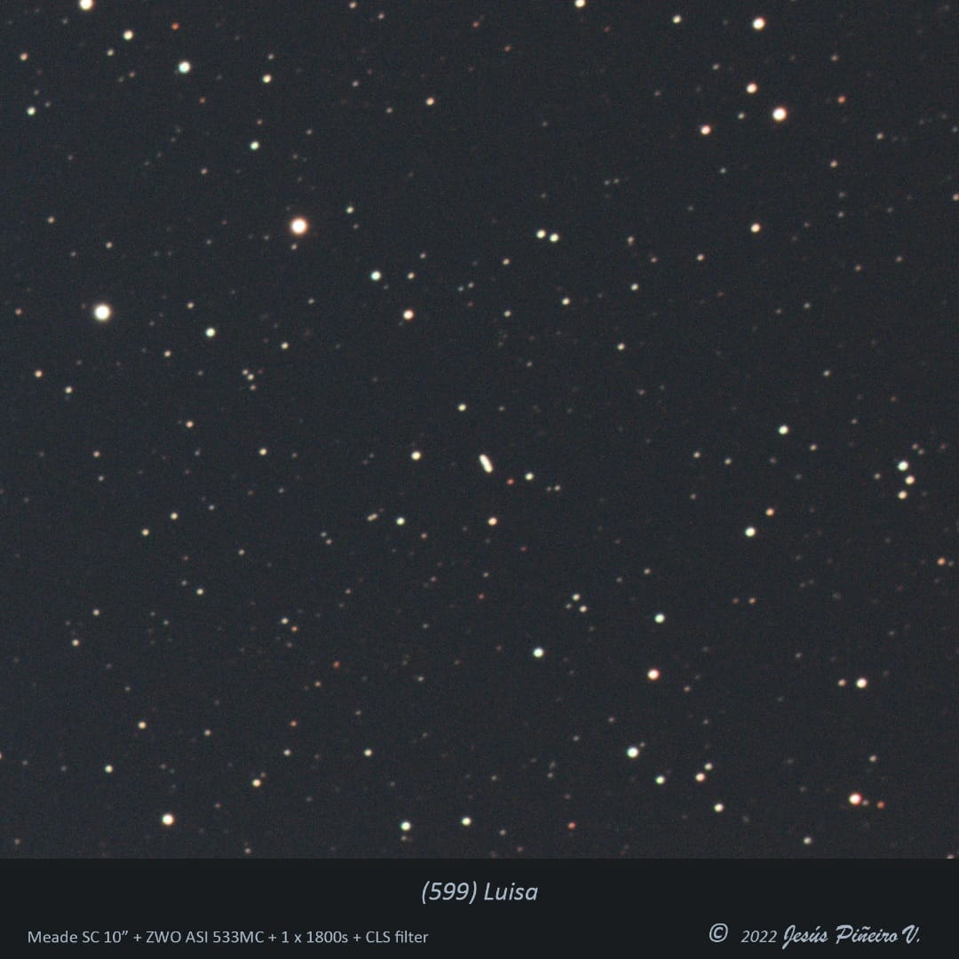 Trazo del asteroide (599) Luisa – 23 de septiembre de 2022. Crédito de la imagen: Jesús Piñeiro, Caracas, Venezuela. El asteroide (599) Luisa, en una toma simple de 30 minutos. Es interesante poder detectar una traza del movimiento relativo del asteroide en tan solo 30 minutos. Su movimiento horario para el momento era de 41.8", por lo que es fácilmente detectable en 30 minutos. La fotografía fue realizada con filtro anticontaminación Astronomik CLS, el cual permitió tan larga exposición sin saturación de fondo. Las imágenes de larga exposición, son especialmente útiles para detectar cuerpos de movimiento rápido. Telescopio Meade SC 10" a 1047mm + ZWO 533MC. |