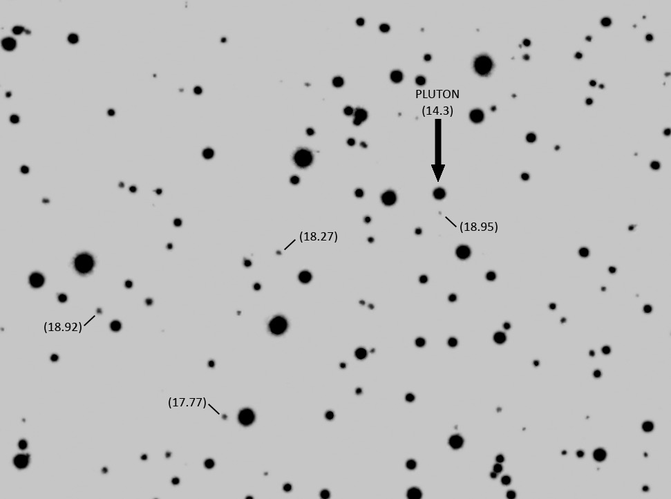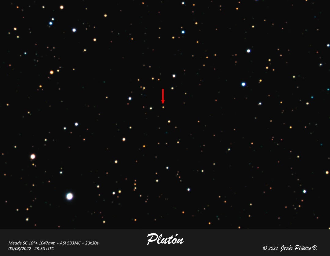 Planeta enano Plutón – 09 de agosto de 2022. Crédito de la imagen: Jesús Piñeiro, Caracas, Venezuela. El planeta enano Plutón en imagen en negativo y altamente contrastada. Pueden observarse estrellas fuera del umbral teórico de detección, estimado en Vmag +17m,8. Uso Vmag y no G, B o Rmag, por razones de simplicidad para mostrar los resultados. Esta detección, aparentemente fuera del umbral, puede deberse a varios factores, entre ellos, la sensibilidad espectral de la cámara, índice de color (B-V) y una posible variabilidad de la estrella. Sin embargo, el ejercicio es entretenido. Siempre hago estas inspecciones de rutina a mis fotografías. Es frecuente encontrar objetos no catalogado o transitorios en el campo, los cuales deben analizarse para descartar posibles artefactos producto de la captura, calibración o procesado de la imagen. |