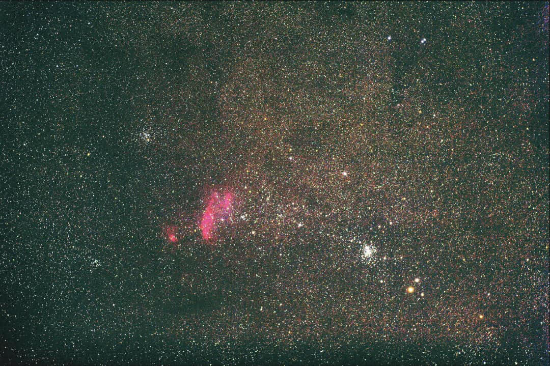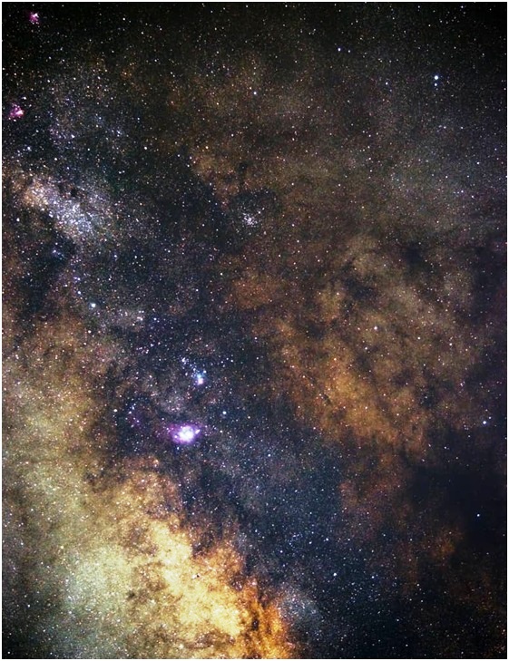 La Vía Láctea. 15 de agosto de 2020. Lente Nikkor 300 mm + Cámara Nikon D5100. 30 minutos de exposición. Se logran apreciar las nebulosas Trífida (M20) y Laguna (M8), el cúmulo estelar abierto M23, encima de este par de nebulosas, la extensa nube estelar de Sagitario (M24), la Nebulosa Omega (M17) y la Nebulosa del Águila (M16). Crédito: Andrés Pineda. |