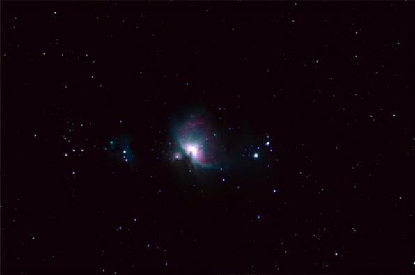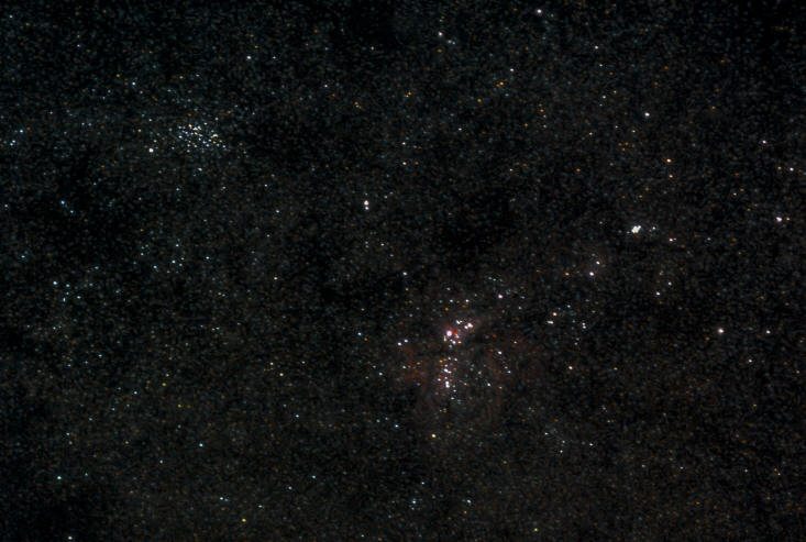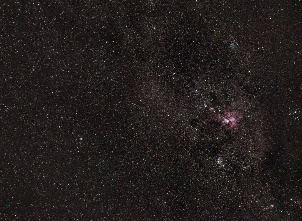 Región de la Nebulosa de Carina (M42). 19 de marzo de 2020. Teleobjetivo Nikkor 55-300 mm + Cámara Nikon D5100. 10 exposiciones de 4 segundos. Crédito: Andrés Pineda. |