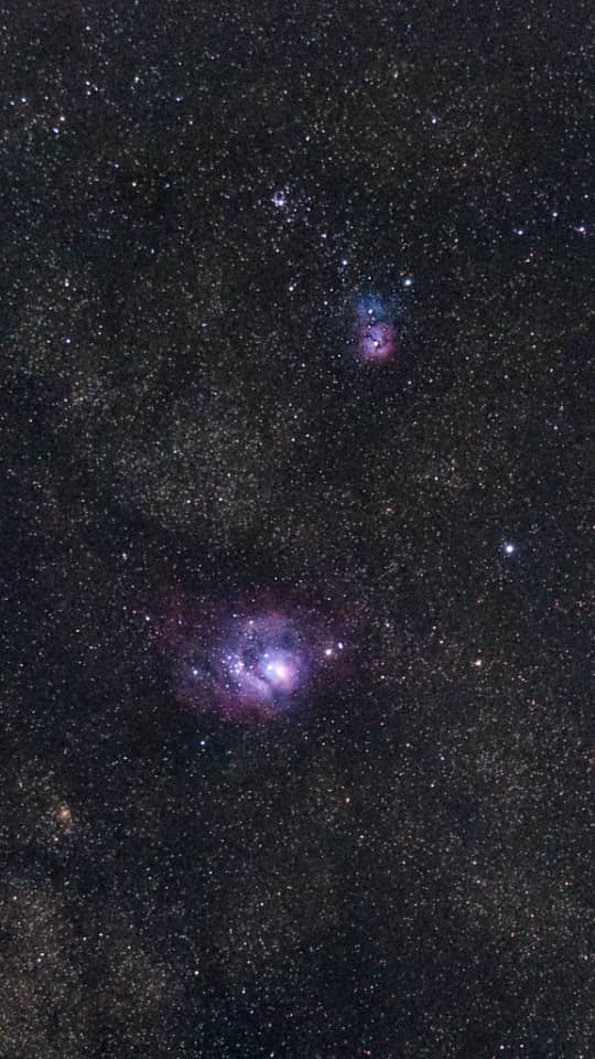 Nubes de Sagitario. Laguna - Trífida. 01 de julio de 2020. Teleobjetivo 200 mm + Cámara Nikon D5100. 10 exposiciones de 4 segundos. Crédito: Andrés Pineda. |