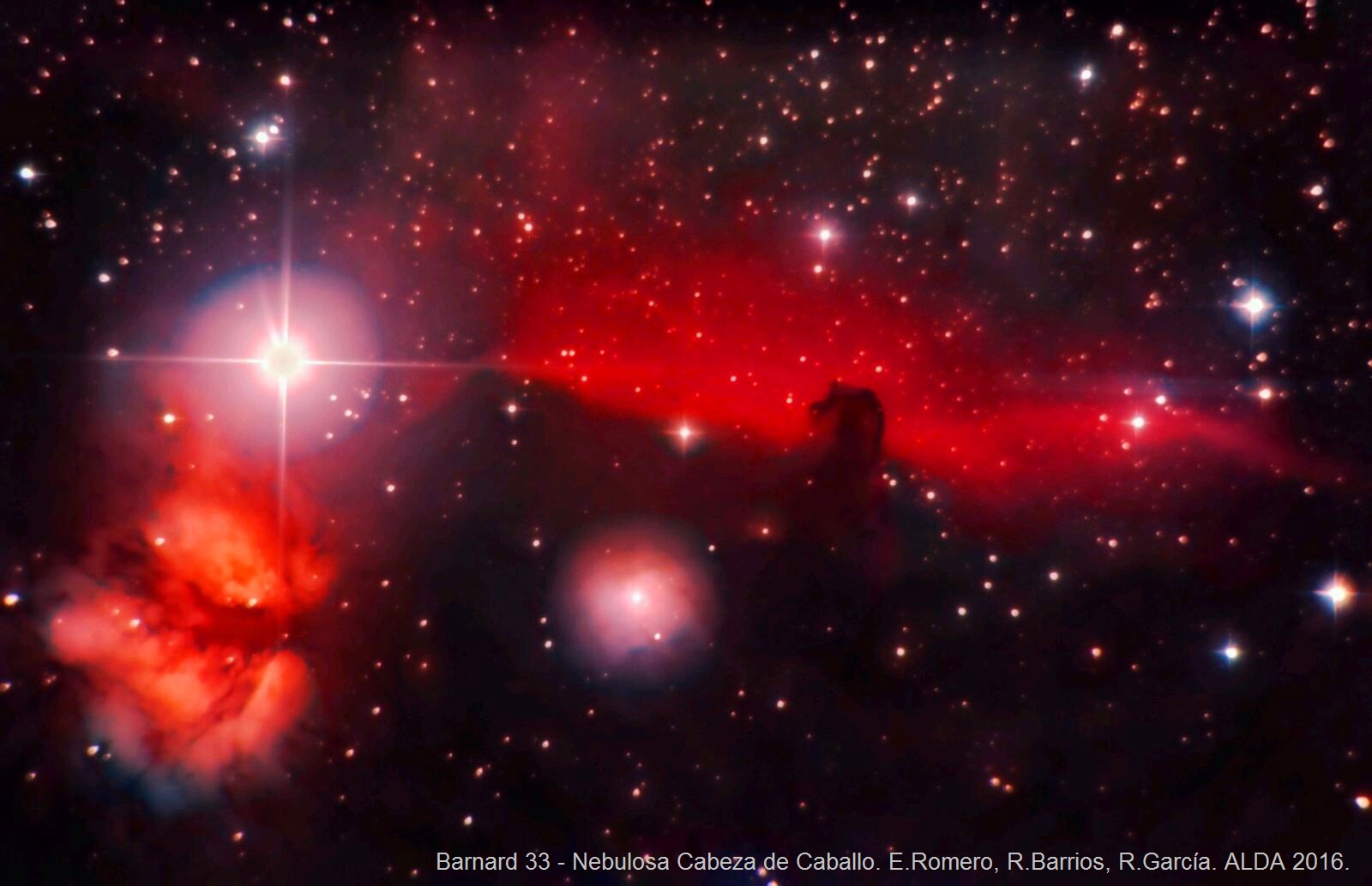 Barnard 33 - Nebulosa Cabeza de Caballo. 11 de febrero de 2016. 13 tomas de 300 segundos de exposición cada una. cámara Cannon EOS 60D a foco primario en reflector de 0,25 metros. Autores: Ernesto Romero, Rafael Barrios, Rafael García. |