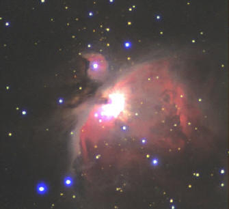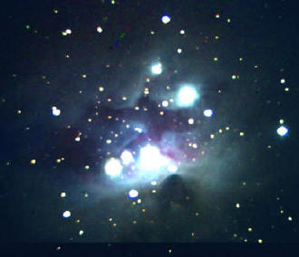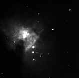 Nebulosa de Orión , M 42 (NGC 1976). Imagen lograda el 11dic2002, con un telescopio Meade 0,2 m y CCD SAC7b, con reductor focal de 3,3. Autor: Rafael Pire. |