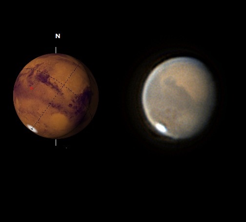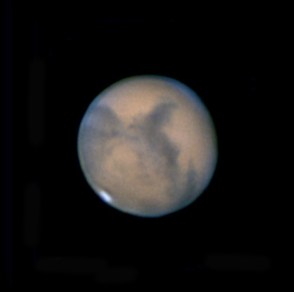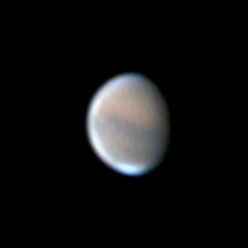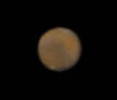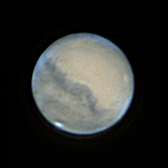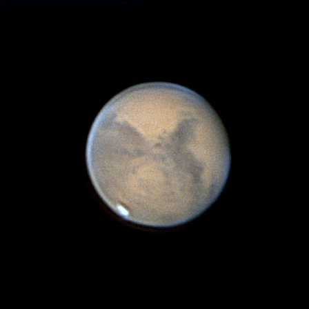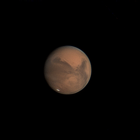 Marte - 04 de noviembre de 2022. Crédito de la imagen: Jacinto Artigas, ALDA, Buenos Aires. Imagen de Marte tomada en la madrugada del día 3: Se logra apreciar ligeramente parte del casquete polar norte. Para esta imagen Marte presentaba un tamaño aparente de 15.35 arcseg, lo que representa un 89% del máximo tamaño aparente que tendrá a principios de diciembre, unos 17.20 arcseg, lejos de los 22.57 arcseg a los que llegó en octubre de 2020. Telescopio NexStar 8 SE + Barlow 2X + cámara Svbony sv 305. |