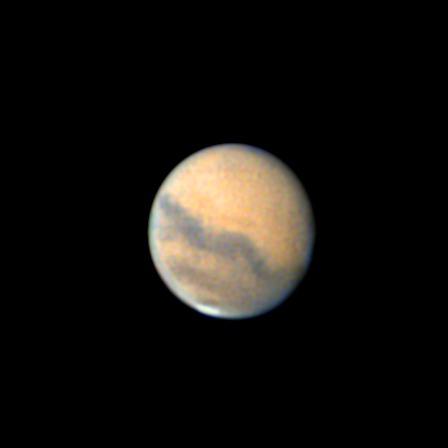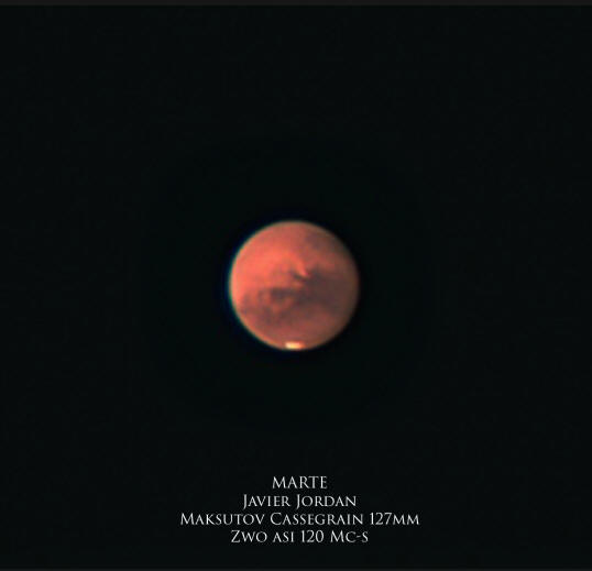 Marte. 30 de junio de 2020. Telescopio Celestron 8 XLT + cámara ZWO 120 MC + Barlow 2X Autor: Jesús López. |
