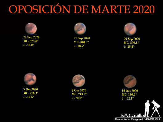 Marte. 16 de octubre de 2020. Telescopio Celestron 11 + cámara ZWO 120 MC + Barlow 3X. Crédito: Jesús López, ALDA, Guarenas, Venezuela. |