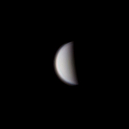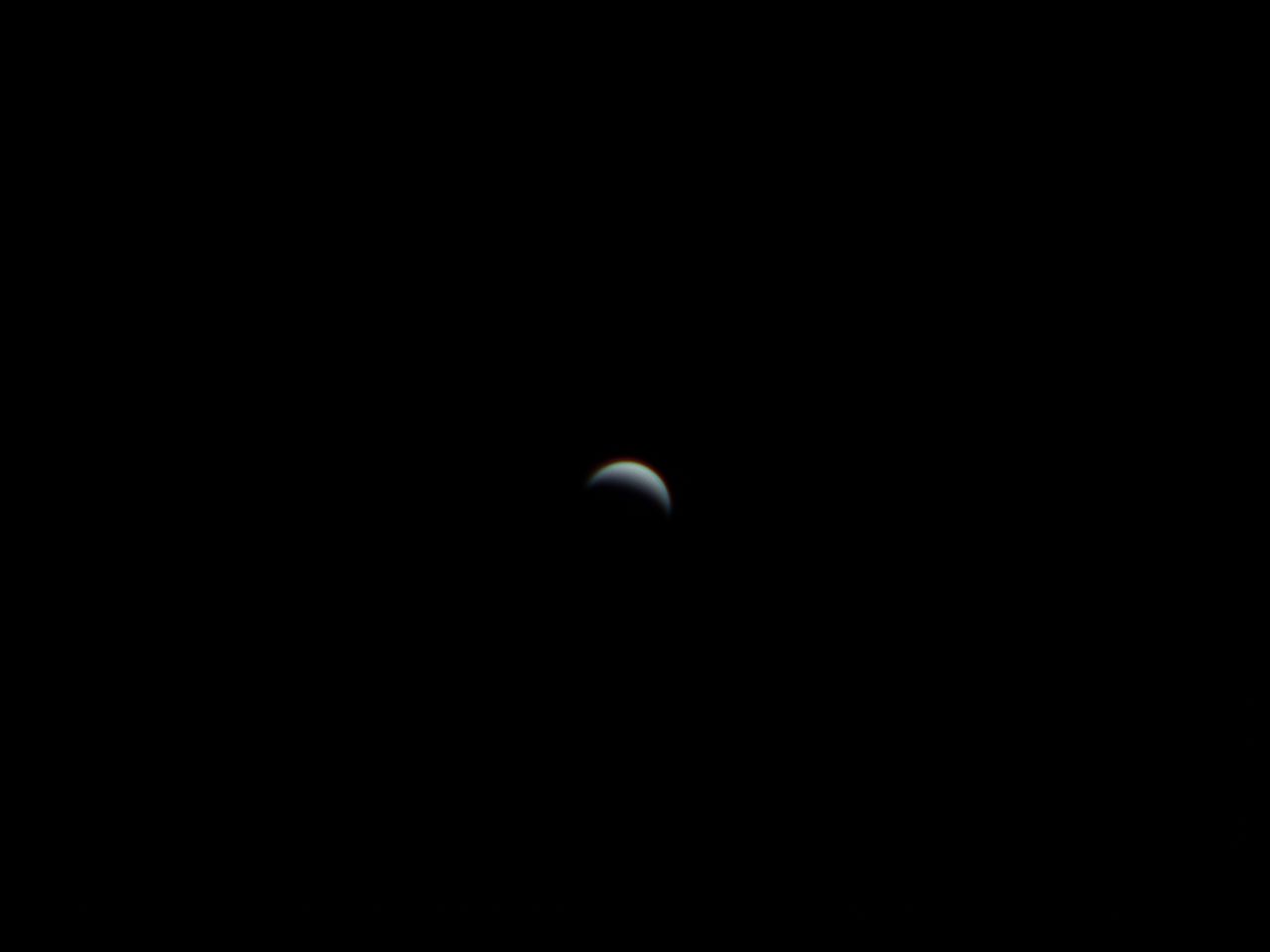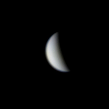 Venus está tarde. Se presenta aún con poco tamaño. Diámetro 16.69", magnitud -4m.10. Telescopio Orión SCT 11", Cámara ZWO ASI12OMC, lente Barlow 2X. Captura Firecapture. Procesado PIPP, AutoStaker, Registex, FitsWork y Gymp.