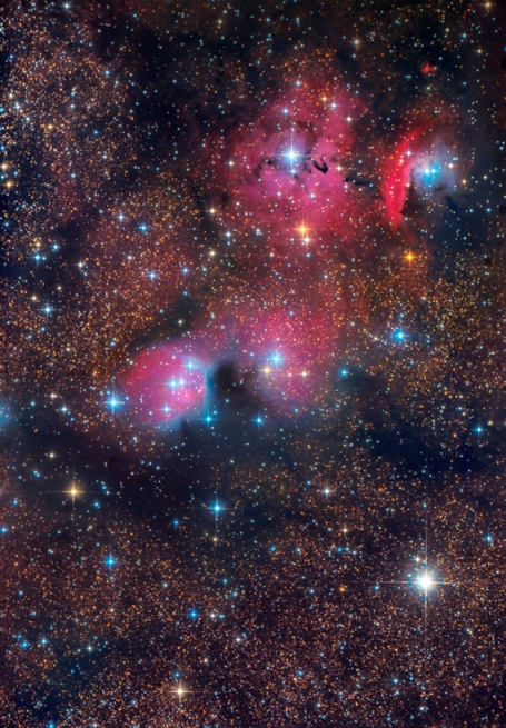 En el centro de la escena se encuentran IC 1274 e IC 1275, regiones rojas circulares separadas por un borde de azulada nubosidad de reflexión, sobre la cual aparece la gran nebulosa oscura B91.