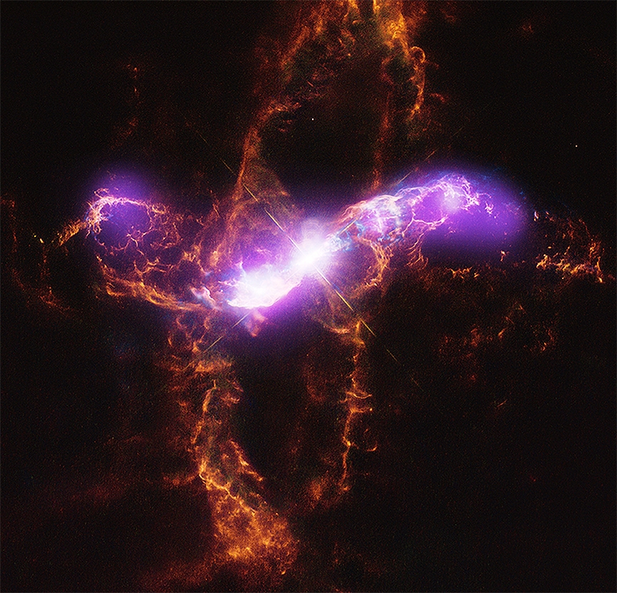 Centrada en esta imagen compuesta tomadas con telescopios espaciales en longitudes de onda óptica/rayos X, esta singular estrella se encuentra a unos 710 años luz de distancia.
