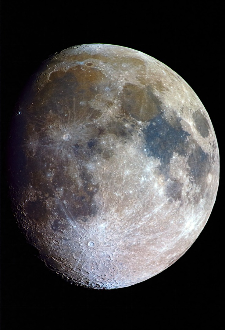 Nuestra Luna, usualmente, se observa sutiles tonos grises o amarillos. Pero cuando se realizan ajustes en la cámara fotográfica y se apilan suficientes imágenes se pueden obtener algunas tonalidades sutiles, representativas de la composición mineral de su superficie.
