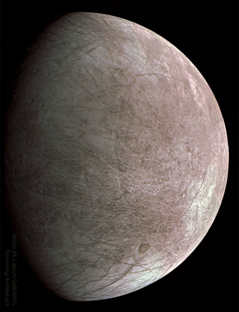 Europa es la sexta luna más grande del Sistema Solar, ligeramente más pequeña que la luna de la Tierra. Los científicos creen que un océano salado se encuentra debajo de una capa de hielo de kilómetros de espesor, lo que provoca preguntas sobre las condiciones potenciales capaces de soportar la vida debajo de la superficie de Europa.